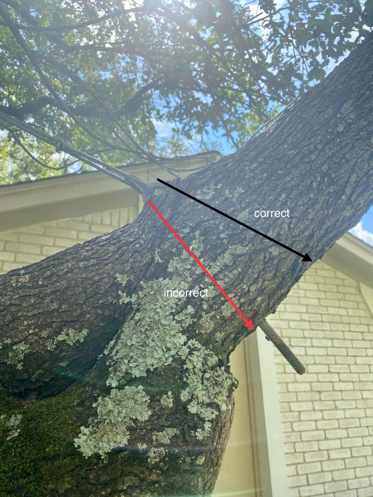 The customer knew what we were also taught as certified arborists, proper installation means no bends, elbows or angles in these anchors in order to not jeopardize their load bearing capacity.